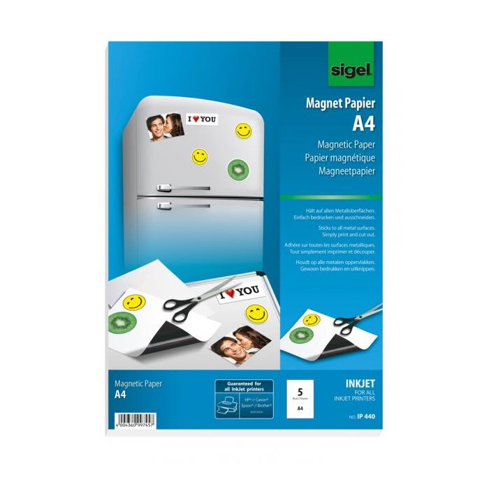 Magnetický papier na tlač a následné použitie na chladničky, magnetické tabule a regály a veľa iného. Papier je zo zadnej strany magnetický a môže byť použitý na každý magnetický povrch. Vhodný do všetkých štandardných atramentových tlačiarní. Formát A4. Balenie 5 hárkov. Farba biela.