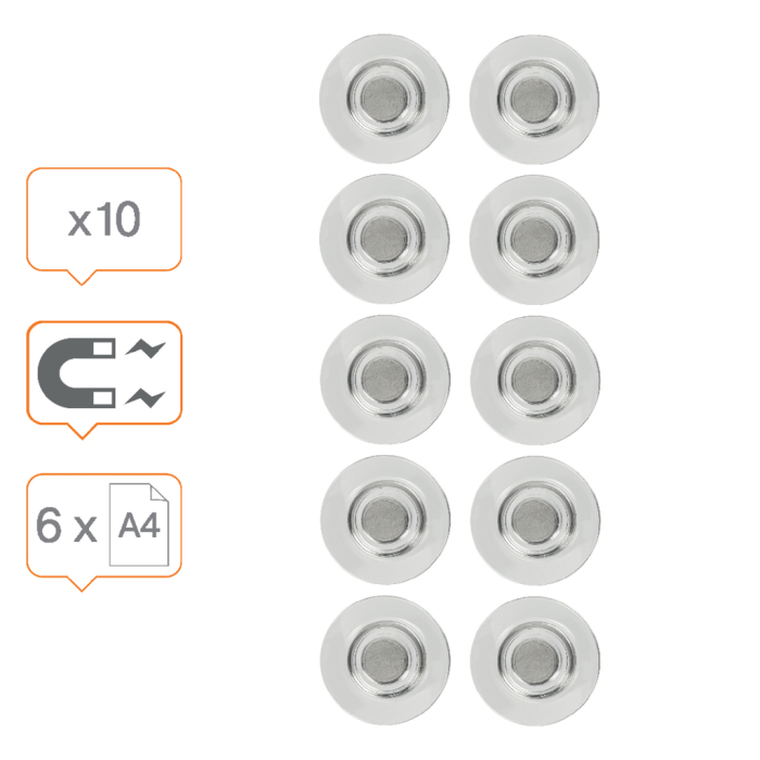 Prezentujte pripomienky a poznámky v kancelárii úhľadne a bezpečne. Magnety zo vzácnych zemín majú veľkú prídržnú silu, ktorá umožňuje upevniť až 6 listov papiera na akýkoľvek magnetický povrch, napríklad na popisovacie tabule, kartotéky alebo nástenky. Balenie: 10 kusov.