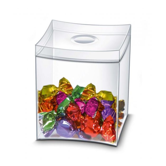 Tento elegantný malý priehľadný box sa prispôsobí vašej fantázii a potrebám - buď ako box na sladkosti alebo na uskladnenie čaju, kávy či korenia. Vyrobený zo 100% recyklovateľného polystyrénu, ktorý je certifikovaný na bezpečnosť pre potraviny. Vonkajšie rozmery (š × v × h) 90 × 104 × 90 mm.