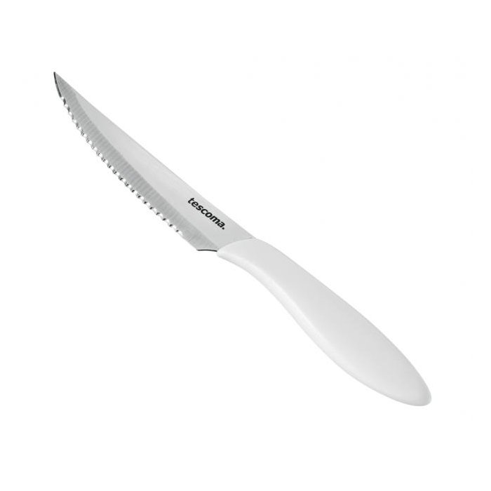 Nože vynikajúce na krájanie prepečených aj krvavých steakov. Sú vynikajúce hlavne na grilovanie a vonkajšie stolovanie. Čepeľ so špeciálne brúsenými zúbkami z prvotriednej nehrdzavejúcej ocele, ergonomická rukoväť z odolného plastu. Po použití umyte a osušte, vhodné do umývačky. 3 roky záruka. Farba biela. Balenie 6 kusov. Dĺžka čepele 12 cm.