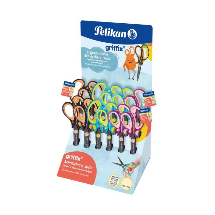 Nožnice Pelikan Griffix Displej 12ks mix farieb 4 ks pre ľavákov 8 ks pre pravákov.