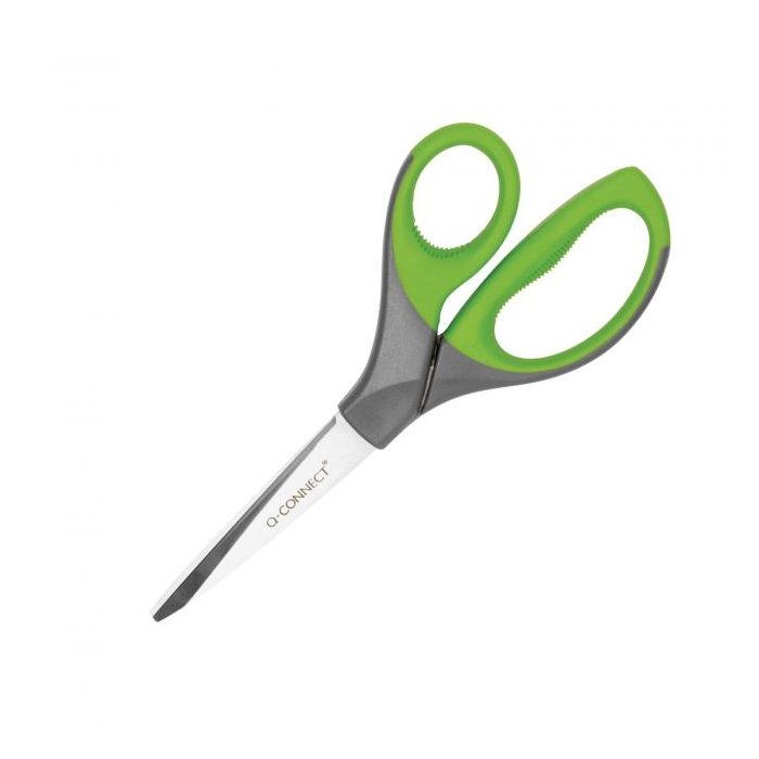 Kancelárske nožnice s ostrým hrotom na strihanie papiera, kartónu, lepenky, samolepiacej pásky a pod. s pogumovaným úchytom a strihacou časťou z nehrdzavejúcej ocele. Farba zelená/ sivá.