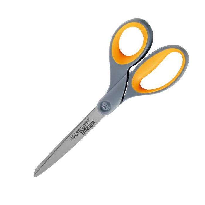 Nožnice z nerezovej ocele potiahuté vrstvou titánu, precízne ostrie pre dlhotrvajúcu ostrosť. Rukoväť s jemným pogumovaním pre komfor pri strihaní. Farba žltá / sivá. Záruka 25 rokov. Väčšie balenie 6 ks. Veľkosť: 23 cm.