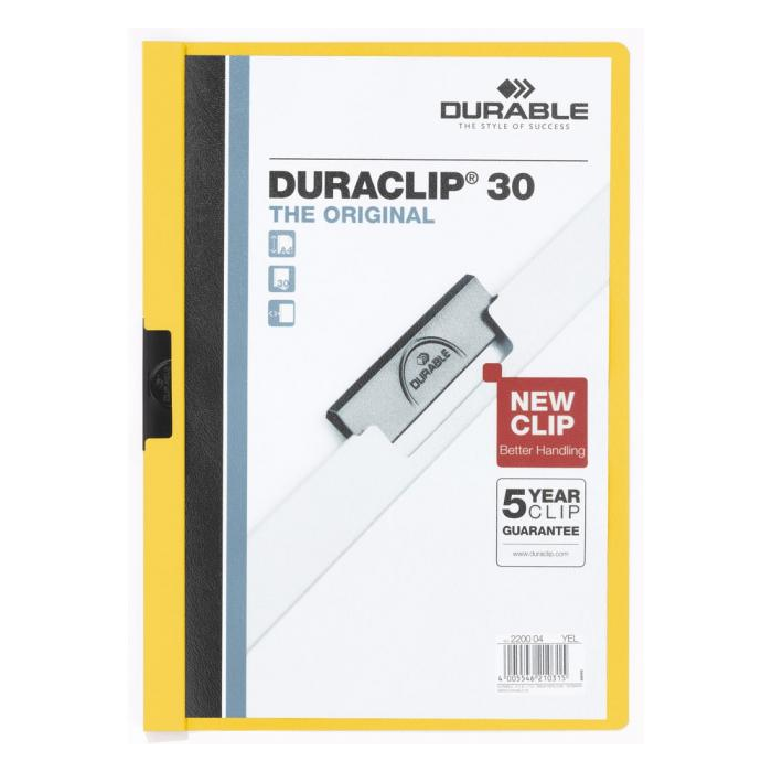 Obal vyvinutý spoločnosťou DURABLE pre viazanie nedierovaných listov. Materiál z PVC s unikátnym kovovým klipom, ktorý sa prispôsobí vloženému počtu listov a priehľadnou prednou stranou. Ideálny na prezentácie, ponuky, správy, poznámky na konferencie, semináre a pod. Formát A4. Kapacita 1-30 listov. Väčšie balenie 25 ks.