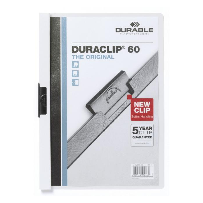 Obal vyvinutý spoločnosťou DURABLE pre viazanie nedierovaných listov. Materiál z PVC s unikátnym kovovým klipom, ktorý sa prispôsobí vloženému počtu listov a priehľadnou prednou stranou. Ideálny na prezentácie, ponuky, správy, poznámky na konferencie, semináre a pod. Formát A4. Kapacita 1-60 listov. Väčšie balenie 25 ks.