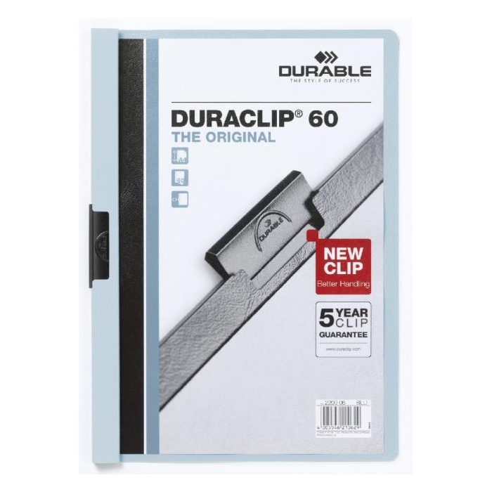 Obal vyvinutý spoločnosťou DURABLE pre viazanie nedierovaných listov. Materiál z PVC s unikátnym kovovým klipom, ktorý sa prispôsobí vloženému počtu listov a priehľadnou prednou stranou. Ideálny na prezentácie, ponuky, správy, poznámky na konferencie, semináre a pod. Formát A4. Kapacita 1-60 listov. Väčšie balenie 25 ks.