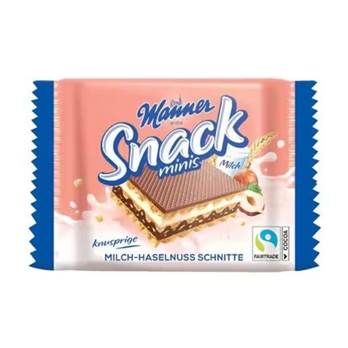 Celozrnné Manner Snack oblátky obsahujú dve vrstvy smotany, chrumkavé oblátky, pečené celozrnné vločky a mliečny krém z lieskových orieškov. Hmotnosť 25 g. Väčšie balenie 30ks.