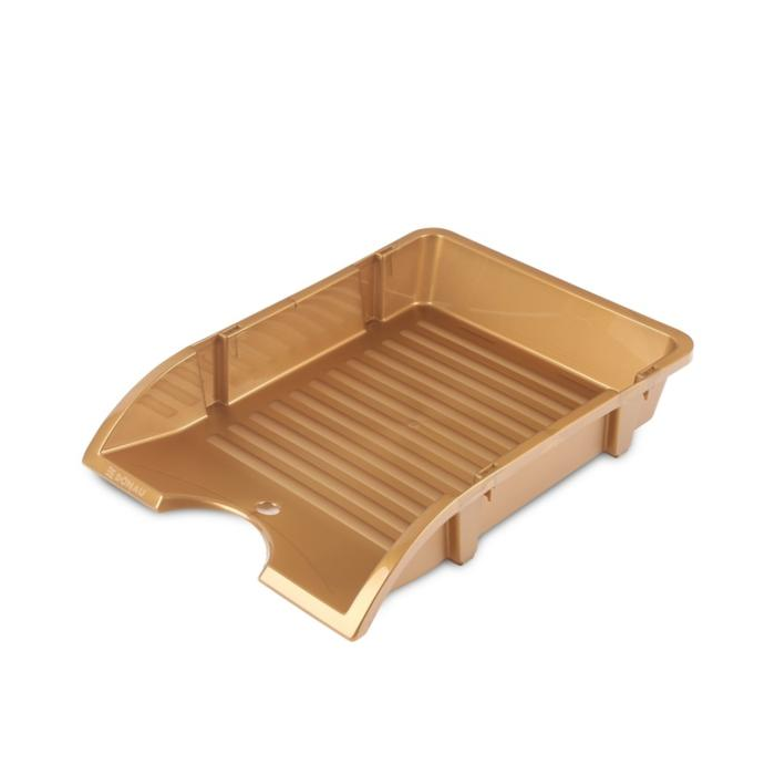 odkladač na stôl s novým originálnym štýlom vyrobené z nerozbitného a deformačne odolného polypropylénu rebrovaný povrch na dne odkladača možnosť vertikálneho spojenia odkladačov a ich umiestnenia na seba pre zníženie objemu počas prepravy otvor v základni a výrezy po stranách pre jednoduché použitie formát: A4 rozmery: 250x345x45mm farba: zlatá