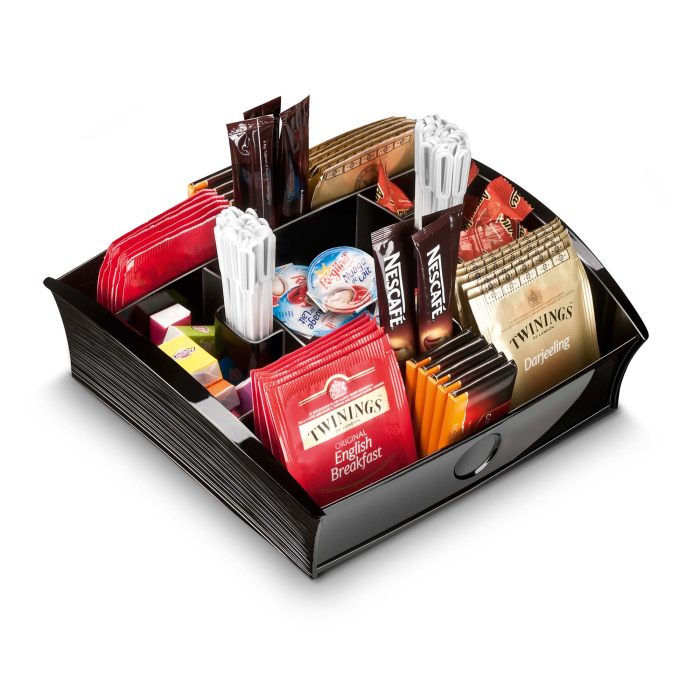 Kľúčom k vúcnemu privítaniu a priateľskému stretnutiu bude tento zásobník, ktorý ponúkne každému pestrý sortiment - čaj, kávu, čokoládu, mlieko, cukor, miešadlá a lyžice. Tento organizér potom môže byť z dôvodu úspory miesta a minimálneho zásahu do priestoru kuchyne veľmi šikovne uložený v hornej časti maxi modulu vedľa kávovaru,či varnej kanvice. Vyrobený zo 100% recyklovateľného polystyrénu, ktorý je certifi kovaný na bezpečnosť pre potraviny. Rozmery (š × v × h) 205 × 216 × 68 mm. Farba čierna.