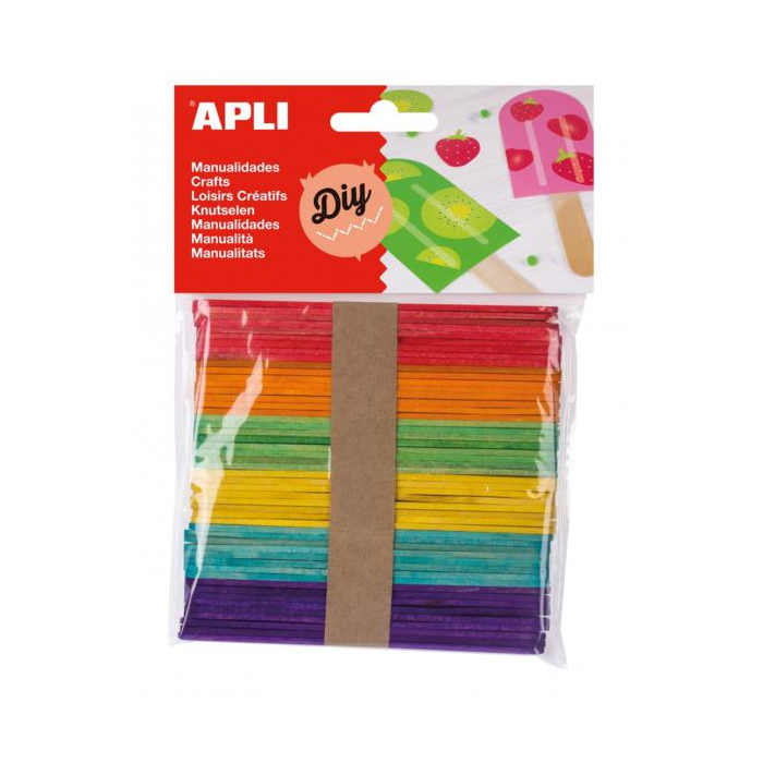 Drevené tyčinky, rozmer 114 x 10 mm, v rôznych farbách: červená, oranžová, zelená, žltá, modrá a fialová. Každé vrecko obsahuje 50 drevených tyčiniek. Veľmi odolné, ľahko sa lepia, maľujú a dokonca aj strihajú. Základný produkt pre školy a detské dielne, ideálny na vytváranie dekorácií, stavebných konštrukcií, bábok, modelov alebo na použitie v iných ručných prácach. Ideálne na stimuláciu detskej fantázie a kreativity.