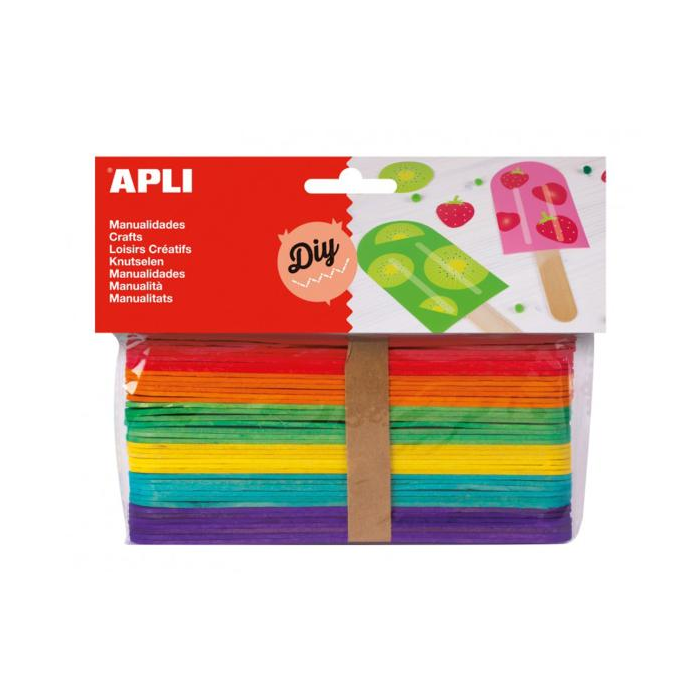 Drevené paličky, rozmer 150 x 18 mm, v rôznych farbách: červená, oranžová, zelená, žltá, modrá a fialová. Každé vrecko obsahuje 40 drevených paličiek. Veľmi odolné, ľahko sa lepia, maľujú a dokonca aj strihajú. Základný produkt pre školy a detské dielne, ideálny na vytváranie dekorácií, stavebných konštrukcií, bábok, modelov alebo na použitie v iných ručných prácach. Ideálne na stimuláciu detskej fantázie a kreativity.