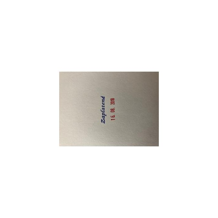 Samofarbiaca dátumová pečiatka v modernom dizajne, s textom ZAPLATENÉ (L2). Integrovaná 2-farebná pečiatková poduška modrá/ červená, kde je text modrý a dátum červený. Výška odtlačku 4 mm.Náhradná poduška E/10 modrá/ červená.
