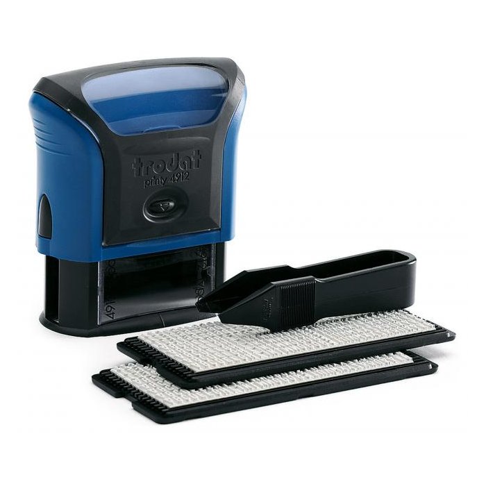 Skladačková samofarbiaca pečiatka zo série Printy Typomatic Line. Sami si zostavíte pečiatku, akú potrebujete. 4 riadky textu, 2 sady znakov: výška písma 3 mm, max. 21 znakov na riadok alebo výška písma 4 mm, max. 17 znakov na riadok. Náhradné podušky typ 6/4912.