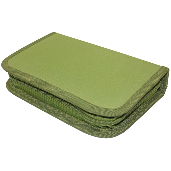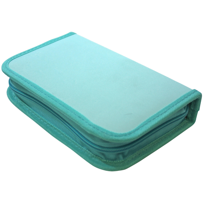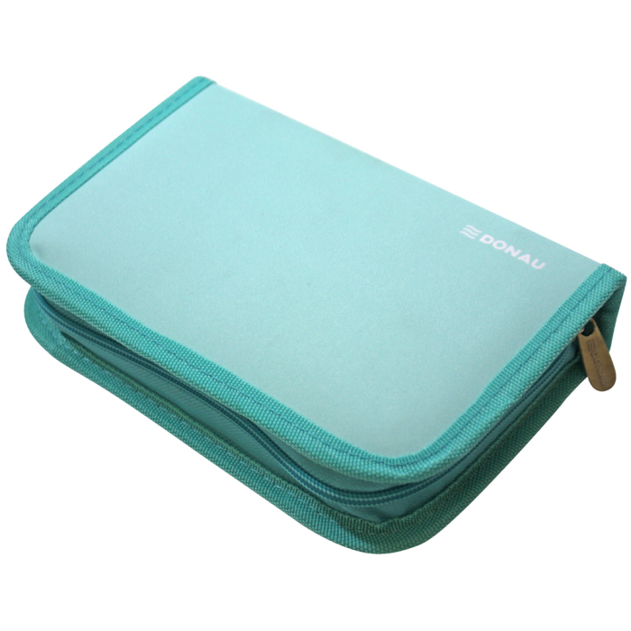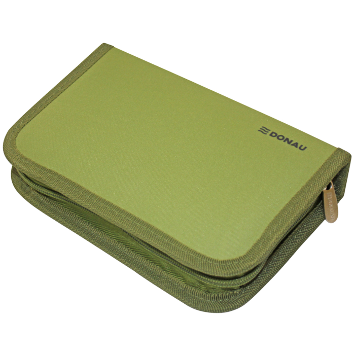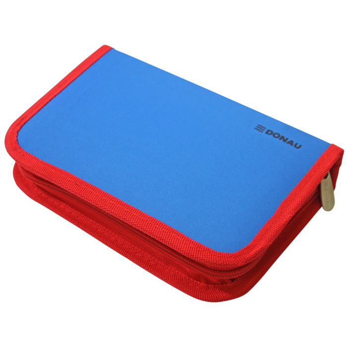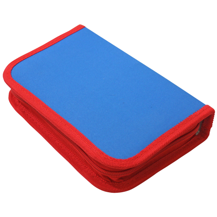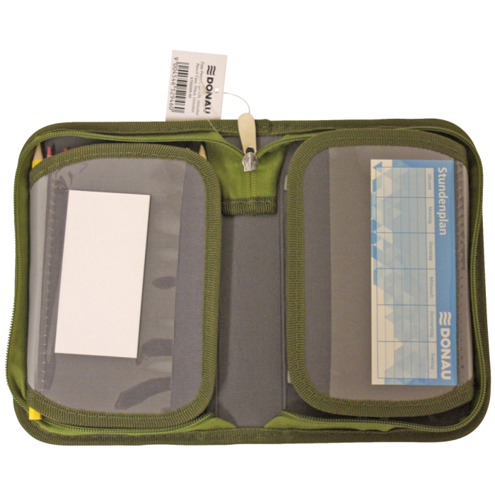 Plný 1-zipsový peračník, 2-chlopňový, 6 rôznych farieb (olivová, modro-červená, tyrkysová, zeleno-modrá, čierno-oranžová, sivo-ružová), 32 kusov (obsah: 1 rozvrh hodín, 1 poznámkový blok bez riadkov, 1 pravítko, 12 farebných ceruziek, 1 guma, 1 strúhadlo, 2 ceruzky, 13 fixiek), materiál polyester, ŠxVxH: 195x36x130mm, hmotnosť 330g.