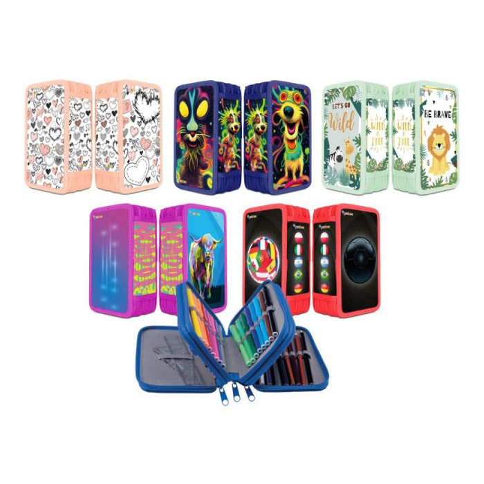 Školský peračník s výbavou v 3 priehradkách. Sada obsahuje: pravítka, 3 perá, ceruzka, guma, strúhadlo, 16 fixiek, 16 pasteliek. Mix motívov.