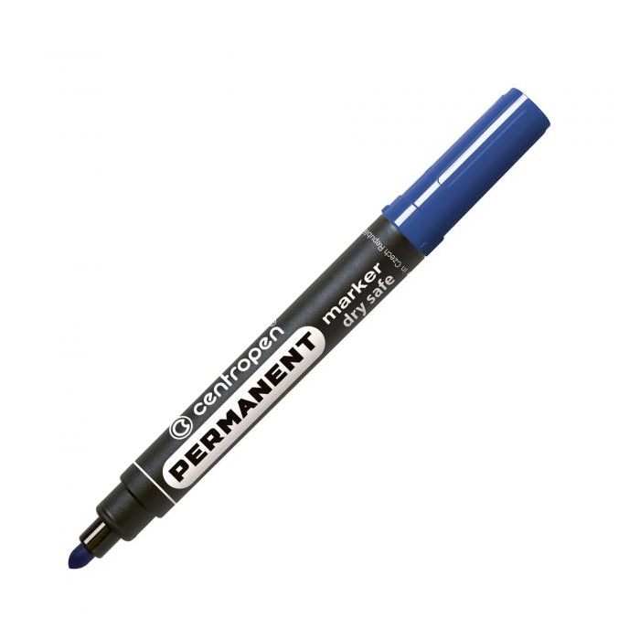 Permanentný popisovač s nevysýchajúcim atramentom (vydrží aj 14 dní bez vrchnáka) na alkoholovej báze, vhodný na väčšinu povrchov. Odolný voči vode, poveternostným podmienkam aj oderu. Hrot okrúhly, šírka stopy 2,5 mm. Väčšie balenie 10 ks v jednej farbe. Farba modrá.
