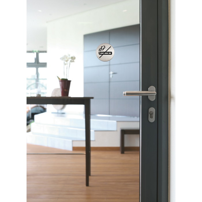 Piktogram na vysoko kvalitnej brúsenej nehrdzavejúcej oceli. Vytlačený symbol je odolný voči poškriabaniu a silnému opotrebeniu. Priemer 83 mm, vďaka lepiacej páske na zadnej strane sa piktogram dá použiť na rôzne povrchy. Farba strieborná, potlač čierna.