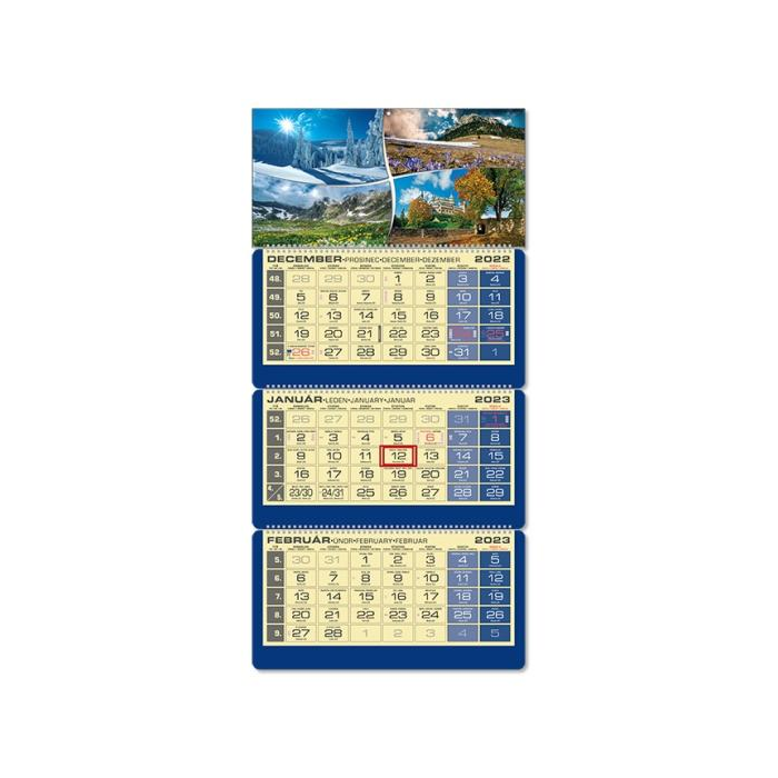 Plánovací kalendár 3-mesačný sivý. Rozmer : 295x870 mm. Rozsah: 3 x 12 listov. Väzba: 1x šitá s perforáciou a 2x špirála.