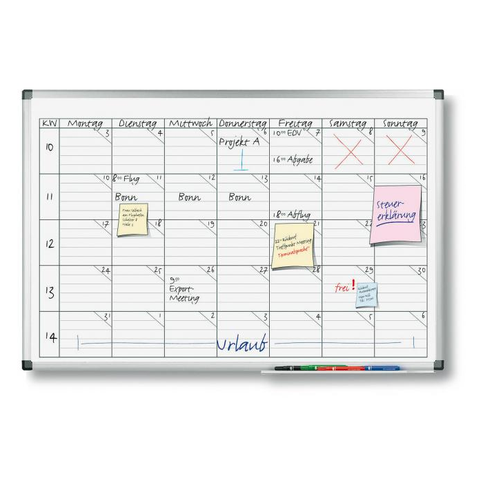 Tabuľa s popisovateľným magnetickým a špeciálne lakovaným a UV tvrdeným povrchom vo verzii týždňového plánovača pre 5 ľudí/ projektov alebo pre jedného človeka na obdobie 5 týždňov. Veľký priestor pre informáciu. Rozmery denného okna 110 × 120 mm. Magnetický popisovateľný povrch. Sada príslušenstva zahrňuje 4 stierateľné popisovače TZ 111 a 8 okrúhlych magnetov priemeru 25 mm. Rozmery: 60x90 cm Veľkosť okna š x v: 120x110 mm Súčasť balenia: popisovače, magnety, 30 cm hliníková odkladacia lišta