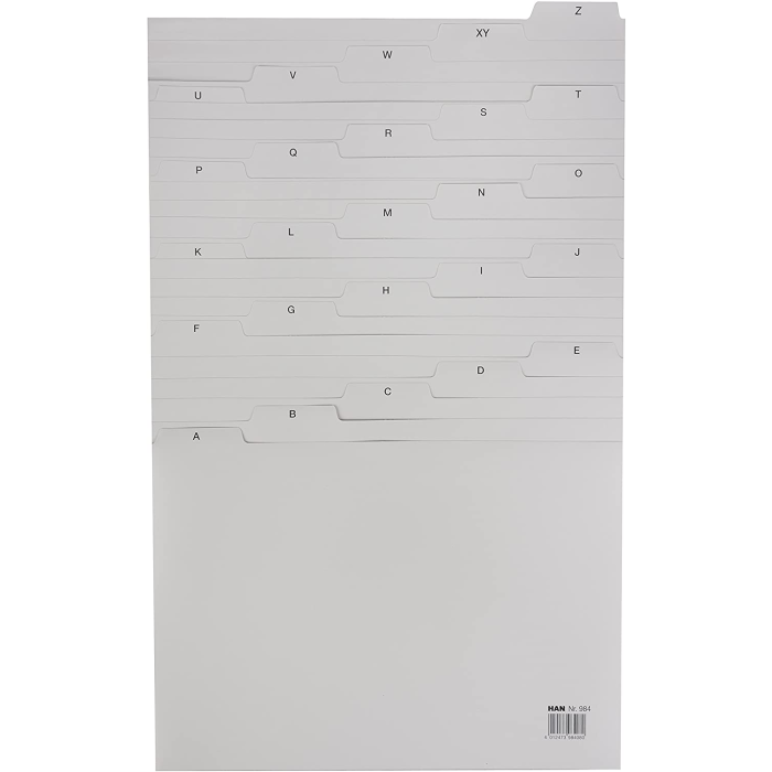 Indexové kartičky A-Z pre stolové kartotéky HAN. Farba sivá.