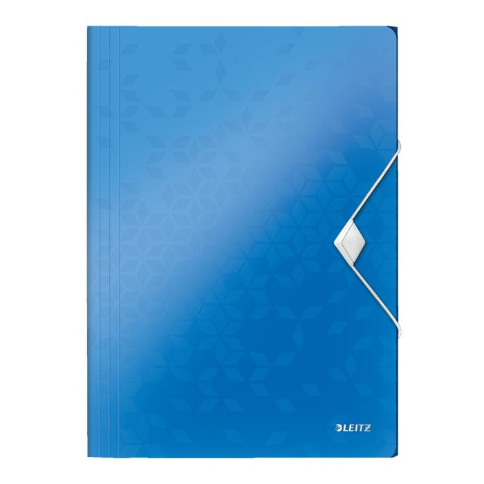 Trojchlopňový obal na dokumenty do formátu A4 z polypropylénu. V dizajne rady WOW v žiarivých farbách. Uzatváranie uchytením na gumičku. Kapacita 150 listov. Väčšie balenie 10 ks. Farba metalická modrá.