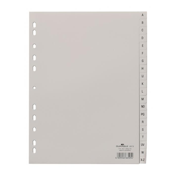 Abecedný rozraďovač z polypropylénu. Formát A4, euro-dierovanie. Balenie jedna sada v polyesterovom sáčku. Väčšie balenie 20 sád. Farba sivá.