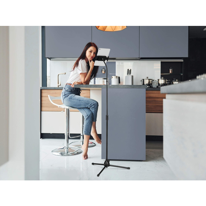 Podlahový stojan s držiakom na tablet a mobilný telefón, vybavený flexibilným ramenom a guľovým kĺbom
