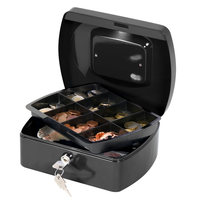 Uzamykateľná pokladnička s tvarovaným úchytom, plastovou priehradkou na mince a 2 kľúčami. Materiál pevná oceľ. Rozmery 205 × 85 × 160 mm. Farba čierna.