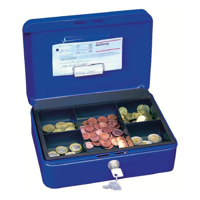 Uzamykateľná pokladnička s tvarovaným úchytom, plastovou priehradkou na mince a 2 kľúčami. Pod vekom zabudovaný klip na prichytenie bankoviek ako prevencia pred ich odfúknutím vetrom. Materiál pevná oceľ. Rozmery v mm: 250x180x90 Farba: modrá
