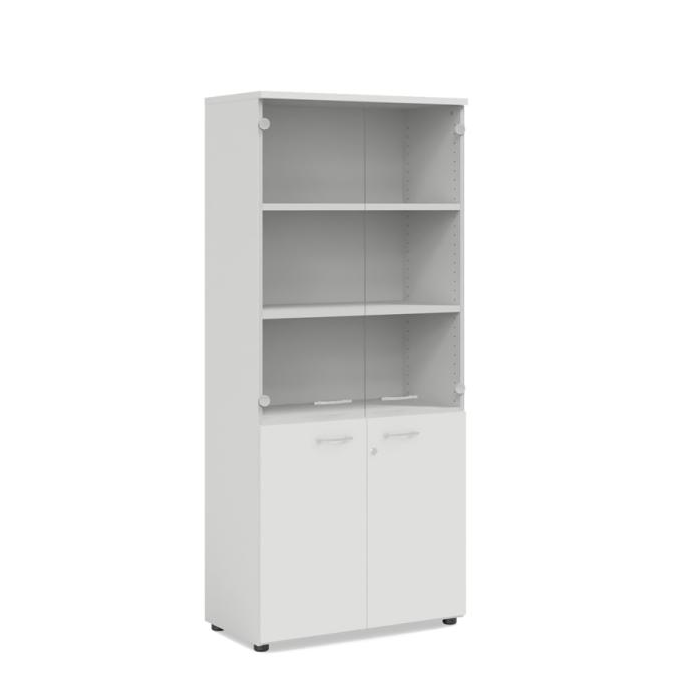 Policová skriňa BASIC, 4 police, kombinovaná so sklom, so zámkom na dolných dvierkach, 80x40x182,1cm, biela