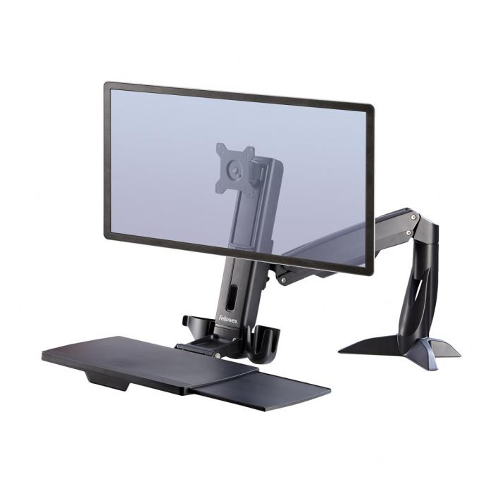 Menší stojan Sit-Stand so sklopným držiakom na klávesnicu a držiakmi príslušenstva. Kompatibilný s VESA, vhodný na 1 monitor do 8 kg a 24`, podložka na klávesnicu do 2,5 kg. Manuálne nastavenie výšky 56 cm pomocou plynového pružinového mechanizmu, čo umožňuje aj zdieľanie obrazovky alebo spoluprácu. K stolu sa upevňuje pomocou svorky, súčasťou je vedenie káblov.