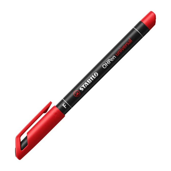 Permanentné popisovače na popisovanie takmer všetkých hladkých povrchov. Nekĺzavá úchytová zóna, praktický klip, bez vrchnáka vydrží až 3 dni. Väčšie balenie 10 ks v jednej farbe. STABILO® OHPen universal Fine (F). Hrot okrúhly, šírka stopy 0,7 mm. Farba červená.