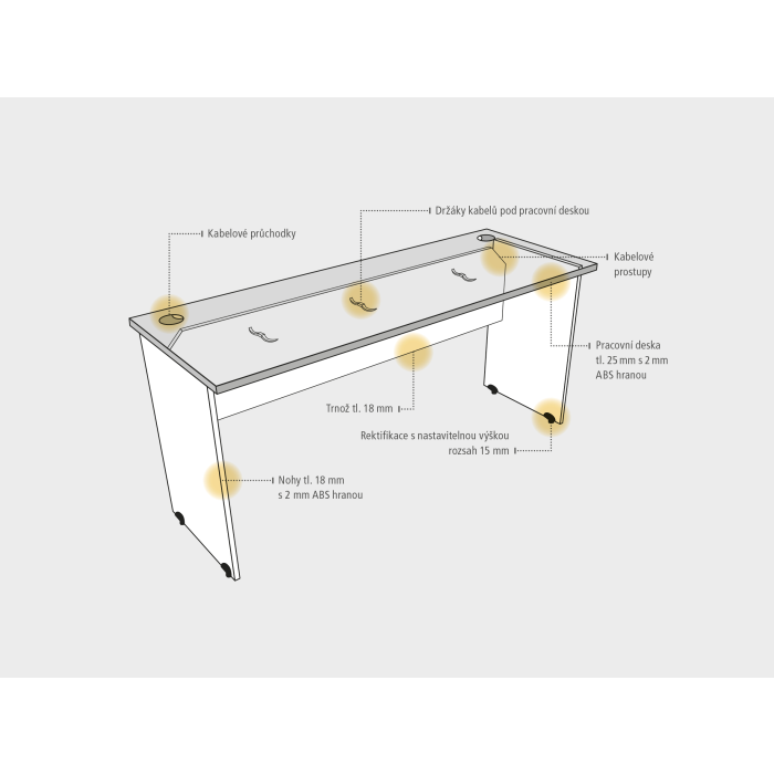 Nadčasový dizajn a užívateľská ústretovosť. Ergonomické tvary pre maximálne využitie pracovnej plochy. Vysoký stupeň súkromia - boky aj priečky z plných dosiek. Vysoká miera stability. Pracovná doska stola má hrúbku 25 mm a je vybavená 2mm ABS hranou, ktorá stoly pomáha chrániť pred poškodením. Dosky a priečky sú hrúbky 18 mm a ich odolnosť zaisťujú 2mm ABS hrany na vonkajšej aj vnútornej strane. Nohy sú osadené výškovo nastaviteľnou rektifikáciou, čo v prípade nerovnosti podlahy umožňuje dorovnať si stôl až o 1,5 cm. Stabilitu stola zaisťuje priečka, tzv. trnož, ktorá spája obe nohy stola. Trnož je vyrobená z plnej, 18 mm hrubej dosky. Široká škála kombinácií - 106 vzájomne kombinovateľných prvkov. Pre zabezpečenie čo najvyššieho komfortu sú v ponuke aj rohové pracovné stoly s ergonomicky tvarovanými doskami, ktoré zodpovedajú norme (STN EN 527-1). O káble od PC alebo stolovej lampy sa postará praktická priechodka, ktorá káble jednoducho zvedie pod dosku, kde si s nimi poradia múdro skonštruované držiaky. Konštrukcia stolov spĺňa vysoké nároky na kvalitu a ergonómiu (STN EN 527-1) a zodpovedá tak normám STN EN 527-2, STN EN 527-3, STN 910001 a STN 910100. Efektivitu dopravy do Vašej kancelárie zaisťujú dodávky jednotlivých dielov stola, ktoré sú bezpečne zabalené. Súčasťou každého balenia je tiež prehľadný návod. Na stoly GATE sa vzťahuje záruka 5 rokov.