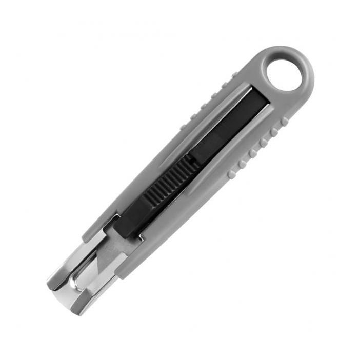 Plastový rezač s automaticky zasúvateľnou čepeľou. Šírka čepele 18 mm. Farba sivá/ čierna.