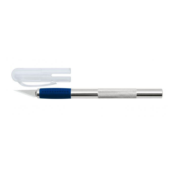 Skalpel na ostré a precízne rezanie papiera, kartónu a fólií. Dĺžka 15 cm. Súčasťou balenia 3 čepele. Náhradné čepele obj. kód WE007821.