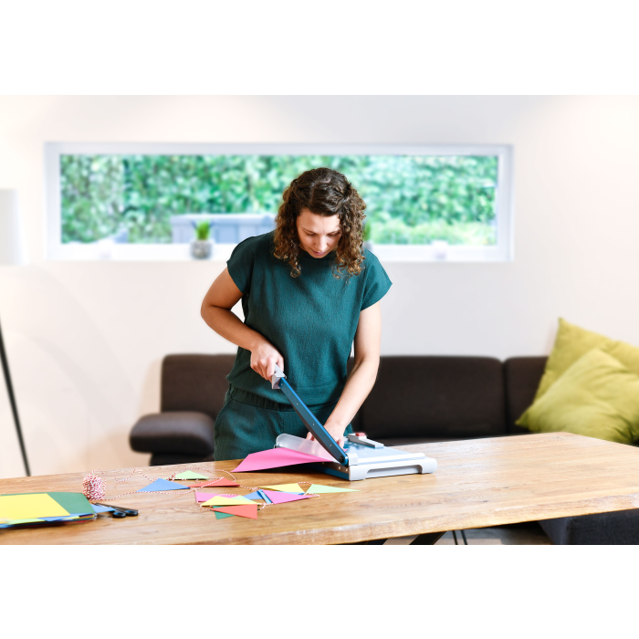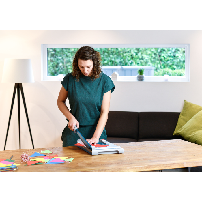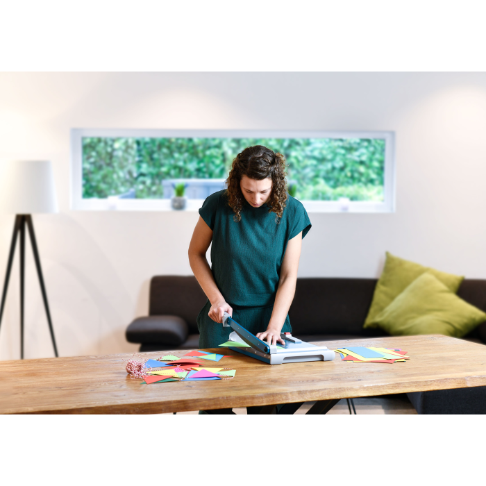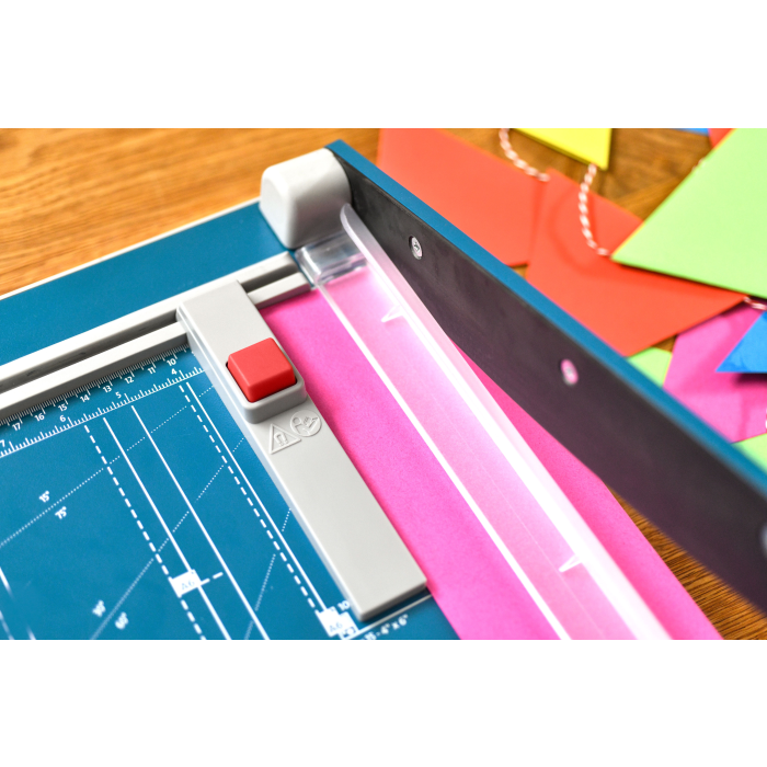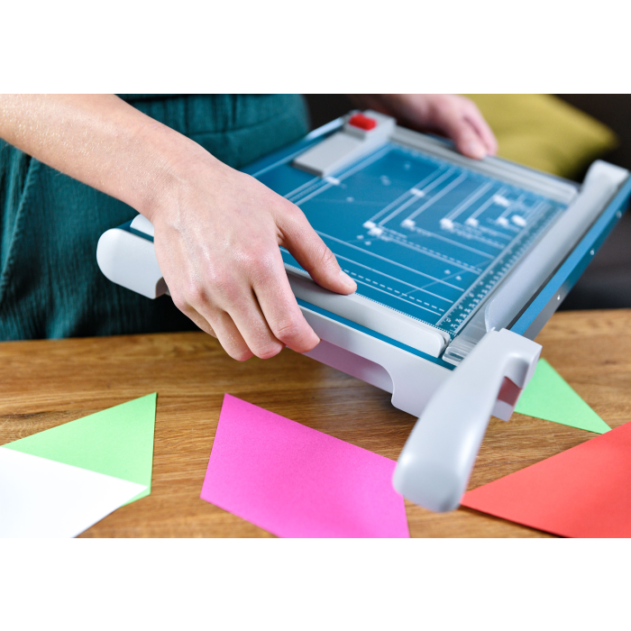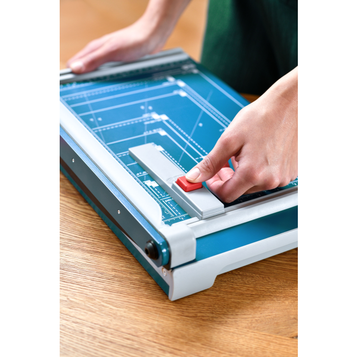 Rezačka z pevného oceľového plechu vhodná na rezanie papiera, kartónu, kože, plastu. Vrchný a spodný rovný nôž vyrobený z kvalitnej nožiarskej ocele Solingen, ručný prítlak s ochranu na prsty. Presná mierka v cm a DIN formátoch, zadný doraz, na spodnej časti výrezy na pohodlné prenášanie.