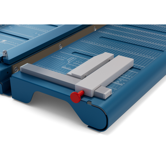 Protišmiková, robustná a presná páková rezačka s kovovou základňou a automatickým prítlakom. Brúsený vrchný a spodný nôž z kvalitnej nožiarskej ocele Solingen, rotujúci kryt okolo ostria. Presná mierka v cm/ inch a DIN formátoch. Výrez na spodnej časti na pohodlné prenášanie. Veľkosť stola 460 × 490 mm. Komfortná výbava s podporným predným stolom a zariadením na rezanie tenkých prúžkov a laserovým lúčom, indikujúcim reznú líniu.