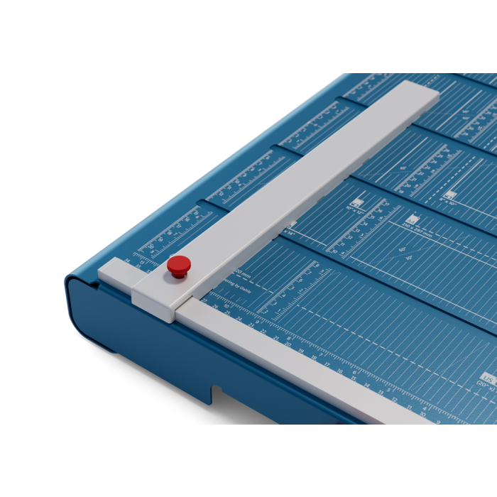 Vysokokvalitná, protišmyková a presná páková rezačka z pevného oceľového plechu. Základný vrchný a základný spodný brúsený nôž vyrobený z kvalitnej nožiarskej ocele Solingen. Rotujúci kryt okolo ostria chráni prsty pred náhodným porezaním. Presná mierka v cm/ inch a DIN formátoch, čiary umožňujúce rezanie uhlových rezov. Automatický prítlak. Výrez na spodnej časti na pohodlné prenášanie. K rezačke je možné objednať podporný stôl so zariadením na rezanie tenkých prúžkov a zariadenie umožnujúce vytvoriť laserový lúč, indikujúci reznú líniu.