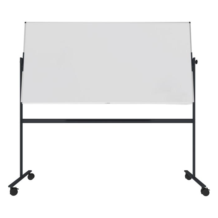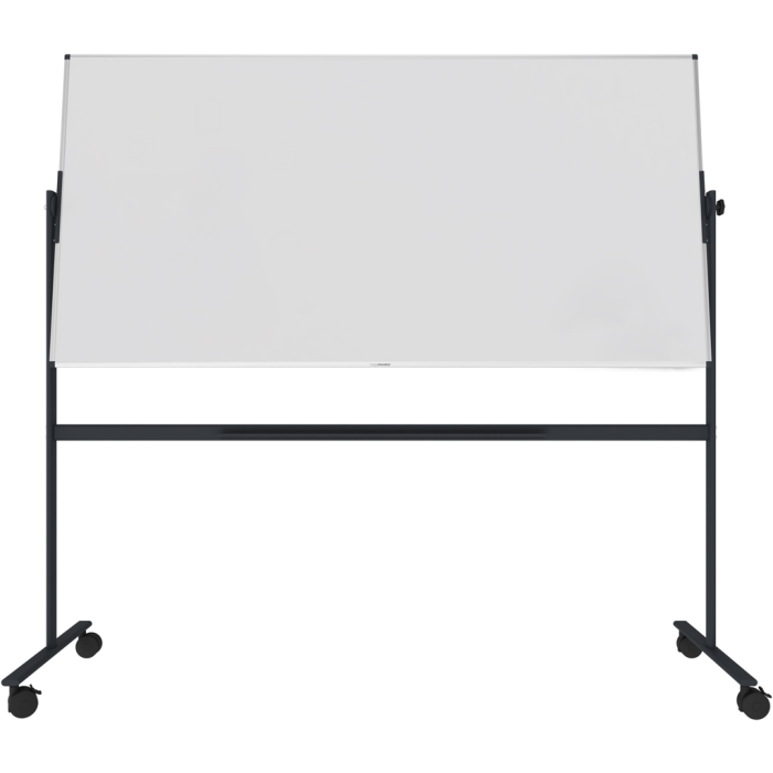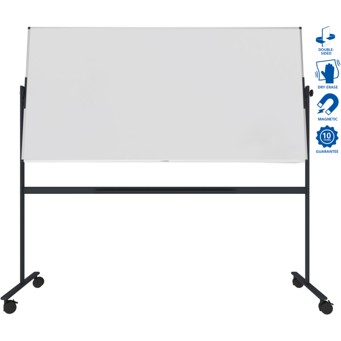 Základná rotačná tabuľa na príležitostné použitie v kancelárii, triede alebo v priemyselnom prostredí. Vhodná na písanie popisovačmi na tabuľu stierateľnými za sucha. Obojstranný, magnetický, lakovaný oceľový povrch dosky. Hliníkový rám so sivými plastovými rohovými krytkami. Upevnený na robustnom a mobilnom stojane s otočnou osou. Súčasťou balenia je odkladacia lišta. Rozmery v × š : 100 × 200 cm.