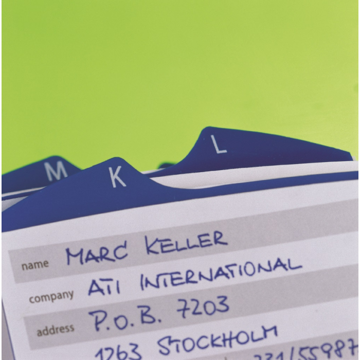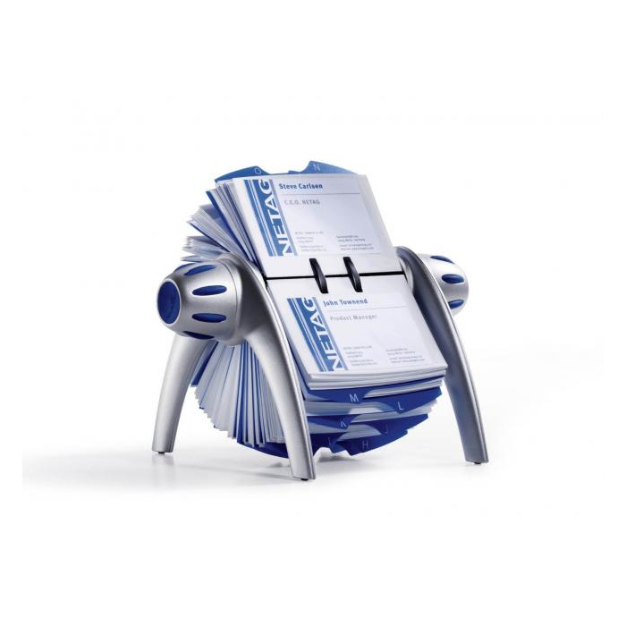Rotačný vizitkár v exkluzívnom dizajne z plastu v kvalitnej povrchovej úprave. 200 obojstranných vreciek rozmeru 72 × 104 mm pre 400 vizitiek, abecedný rozraďovač s 25 oddielmi. Doplniteľný náhradnými vreckami Obj. kód DU241819.