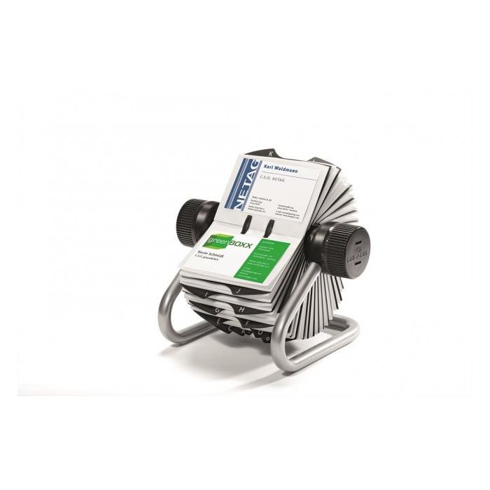 Rotačný vizitkár s 200 obojstrannými vreckami rozmerov 104 × 72 mm na 400 vizitiek. Dodávaný s 25 abecednými rozraďovačmi A - Z. Ľahký prístup k vizitkám, rýchla obsluha vďaka špeciálnemu rotačnému mechanizmu. Farba strieborná.