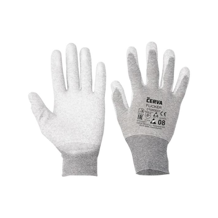 Pletené, bezšvové, antistatické, nylonové rukavice s integrovaným uhlíkovým vláknom, vrstvou polyuretánu v dlani a na prstoch a pružnou manžetou.