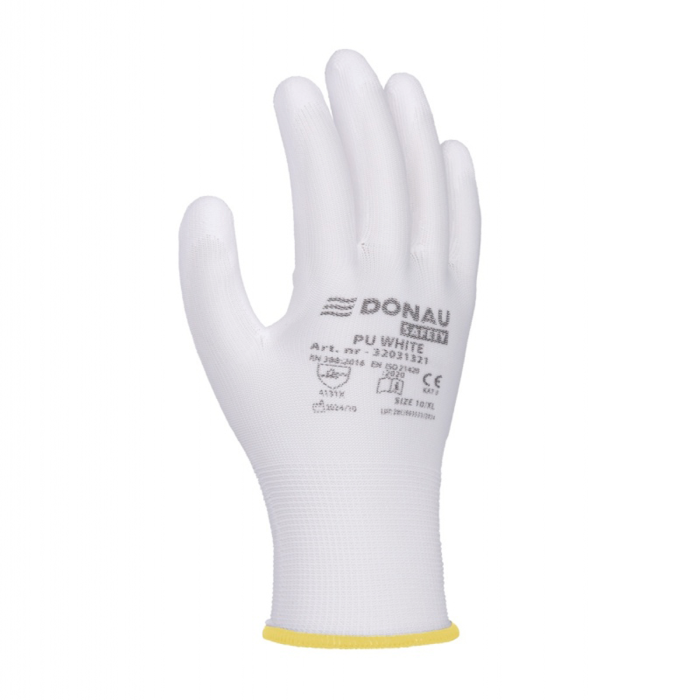 rukavice z kvalitného polyesterového úpletu v bielej farbe, v oblasti úchopu potiahnuté bielym polyuretánom