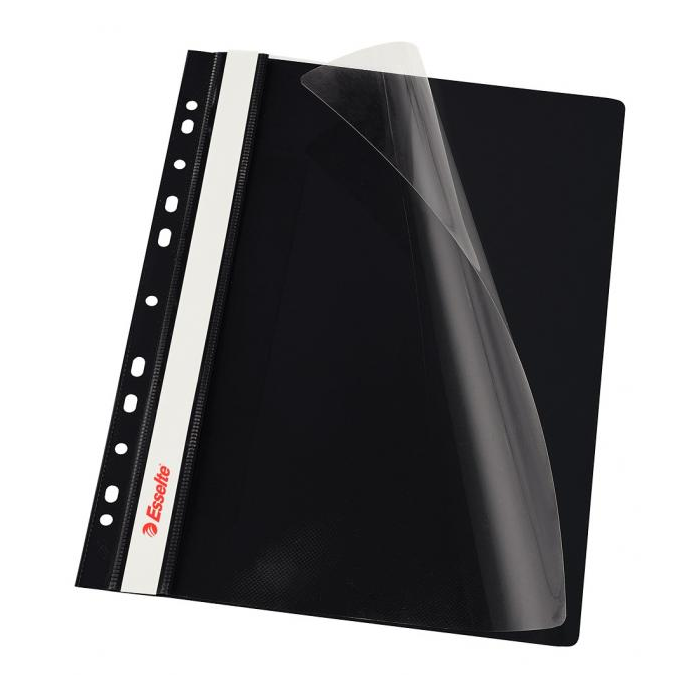 Obal s eurodierovaním z kvalitného PVC na uloženie dierovaných dokumentov do formátu A4. Predná strana priehľadná, pozdĺž chrbta biely obojstranný papierový zasúvací štítok. Rozmery 310 × 235 mm. Farba čierna.