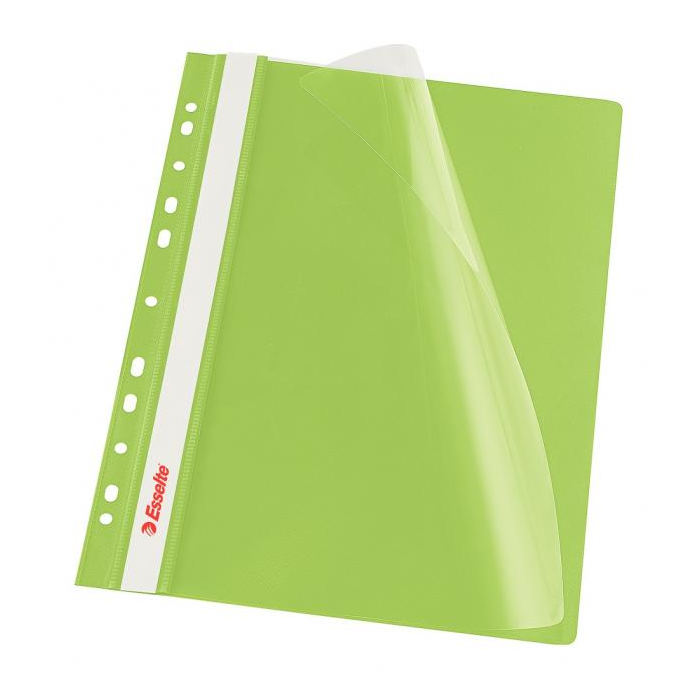 Obal s eurodierovaním z kvalitného PVC na uloženie dierovaných dokumentov do formátu A4. Predná strana priehľadná, pozdĺž chrbta biely obojstranný papierový zasúvací štítok. Rozmery 310 × 235 mm. Farba zelená.