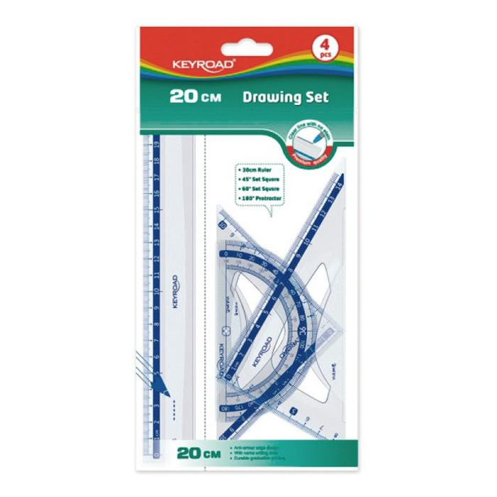 Sada plastických geometrických pomôcok, užitočná pre každého študenta. Mierka podľa noriem. Sada: pravítko 20 cm, uhlomer 10 cm, sada trojuholník 14 cm a 10 cm. Farba transparentná.