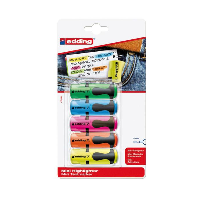 5 kusová sada mini zvýrazňovačov edding so zrezaným hrotom so šírkou stopy 1 - 3 mm. Neónový pigment s maximálnym jasom, protišmyková ergonomická rukoväť. Uzáver s klipom.