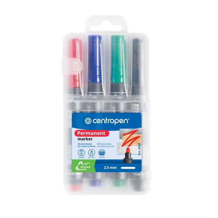 Sada 4 ks permanentných popisovačov. Atrament na alkoholovej báze odolný voči vode a teplote do 100 °C. Hrot okrúhly, šírka stopy 2,5 mm. Farba: sada 4 ks Šírka stopy: 2,5 mm Typ hrotu: okrúhly