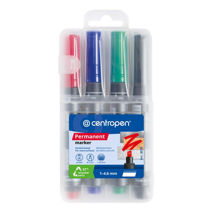 Permanentný popisovač na alkoholovej báze, vhodný na väčšinu povrchov. Odolný voči vode, poveternostným podmienkam aj oderu. Hrot zrezaný, šírka stopy 1 - 4,6 mm. Väčšie balenie 10 ks v jednej farbe. Sada štyroch farieb.
