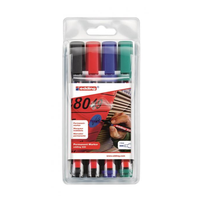 Permanentný popisovač vhodný na trvanlivé popisovanie, značenie, maľovanie a vyznačovanie takmer na všetky materiály vrátane kovu, skla a umelých hmôt. Plastový obal. Zrezaný hrot, šírka stopy 1,5 - 3 mm. Dopĺňateľný atramentom edding MTK 25 obj. kód ED250001 -4. Sada 4 ks v mixe farieb.